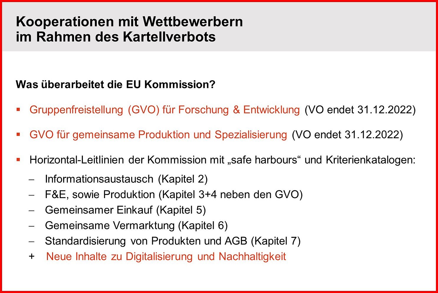 Bei unserem Monatsbriefing Kartellrecht am 07.12.2021 haben wir einen Ausblick auf das neue Horizontal-Paket der EU-Kommission gegeben. Wir haben den Umfang des Horizontal-Pakets und die wesentlichen Kritikpunkte und Reformbestrebungen vorgestellt.