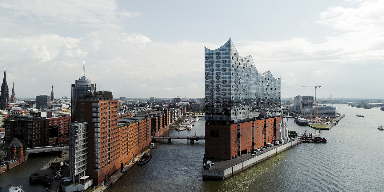 Biegen Sie links in die Überseeallee, dann rechts in die Osakaallee und wieder links auf Am Sandtorkai.